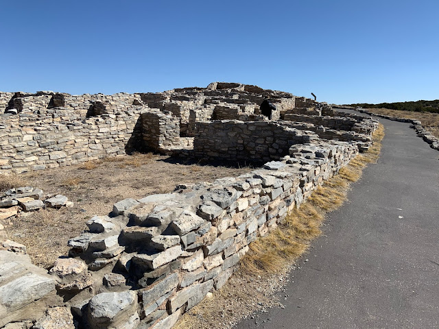 Reading the many brochures we have, we learned that Nomadic Indians arrived in the Salinas (Salt) Valley as long as 20,000 years ago. By the 10th century, the Mogollon had built villages with partially underground pithouses as dwellings. By the 11th century, Ancestral Puebloans (also called Anasazi, "ancient enemy," but inaccurately, according to the Indian Pueblo Cultural Center in Albuquerque)—who built rectangular complexes, had become dominant in the area. Thus the Salinas Valley society derived from an overlapping of Anasazi and Mogollon cultures. The Puebloans farmed and hunted, and the area was a regional trading center, made especially valuable by the nearby salt lakes, salt being a much sought after commodity. In the late 16th century, an explorer reported over 40,000 people living in 11 pueblos in the area.